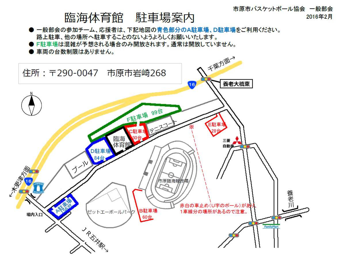 | 1 | 三井化学体育館 | 台数制限なし | 青柳社員駐車場を利用。体育館付近及び路上駐車厳禁。 入口、出口は一方通行(16号側は出口専用)。 | |